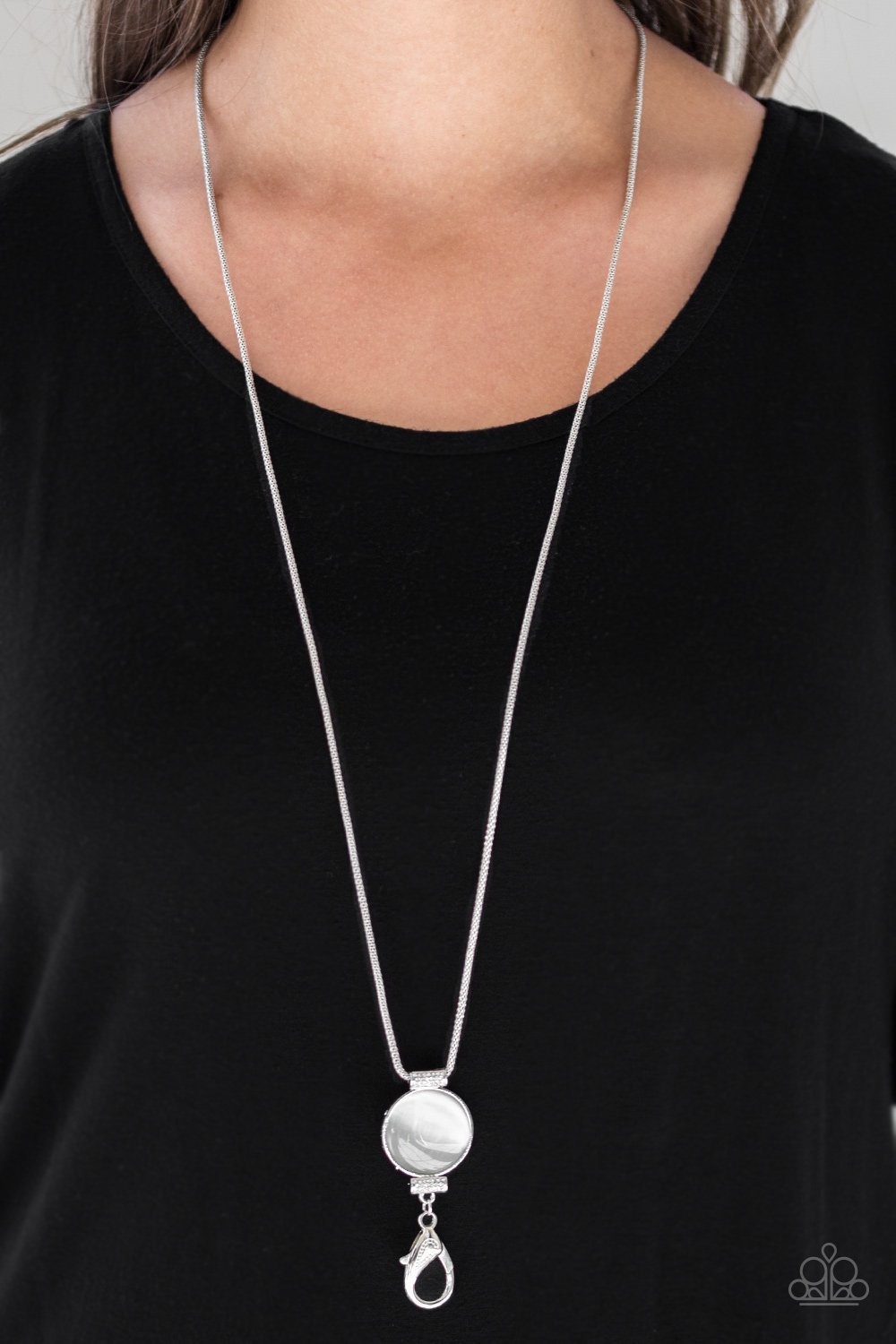 Infused with white rhinestone encrusted fittings, a glowing white moonstone pendant swings from the bottom of a rounded silver mesh chain for a whimsical look. A lobster clasp hangs from the bottom of the design to allow a name badge or other item to be attached. Features an adjustable clasp closure.